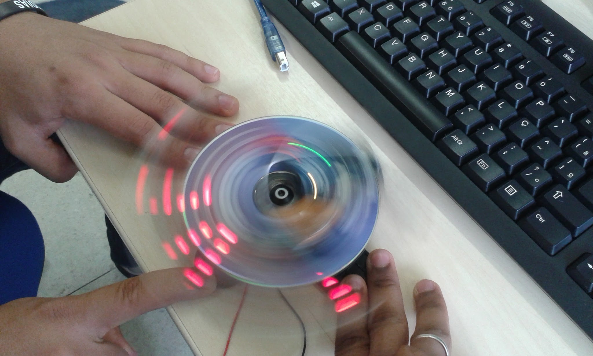 Enquanto fazíamos as pesquisas a respeito do POV utilizando o Arduino, levantamos alguns dilemas. Dentre eles, um dos principais foi: como medir com mais eficácia a frequência (velocidade de rotação) do motor sem utilizar nada mais além do que temos, sem deixar de considerar a variação causada pelo peso do aparato fixo ao CD? A alternativa foi procurar algo que já existisse e que pudéssemos adaptar. No fim, como o peso e a variação da base alteraram a estabilidade / velocidade do conjunto como um todo, foi importante ter levantado esse questionamento desde o começo. A ideia por trás de todo esse aparato é criar símbolos (no nosso caso, letras) que possam ser escritos utilizando-se da piscada dos LEDs que, de acordo com a frequência de rotação do disco, sejam capazes de formar conjuntos (no nosso caso, palavras) que se repitam de forma estática criando a ilusão de um display que transmita algum tipo de mensagem.