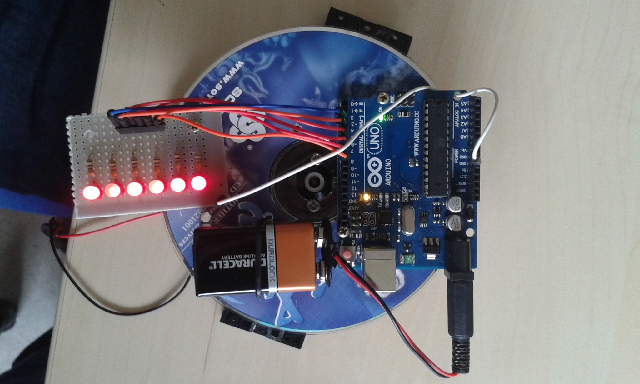 A forma que encontramos de criar nossa base foi utilizando um CD-ROM velho, que tem o formato ideal para a realização da rotação e espaço necessário para acomodação dos componentes (protoboard com os leds, bateria e o Arduino). Distribuídos lado a lado de forma que não prejudicasse o movimento, a bateria com adaptador para energia foi fixada ao lado do Arduino para facilitar a alimentação dele, já que o próprio objetivo do projeto impedia que ele fosse alimentado via USB por razões físicas óbvias. Na placa, foram configurados como saída os pinos digitais 2, 3, 4, 5, 6 e 7. Um para cada LED respectivamente, que se encontram dispostos na protoboard, interligados pelos resistores que foram soldados abaixo para não escaparem durante o movimento.