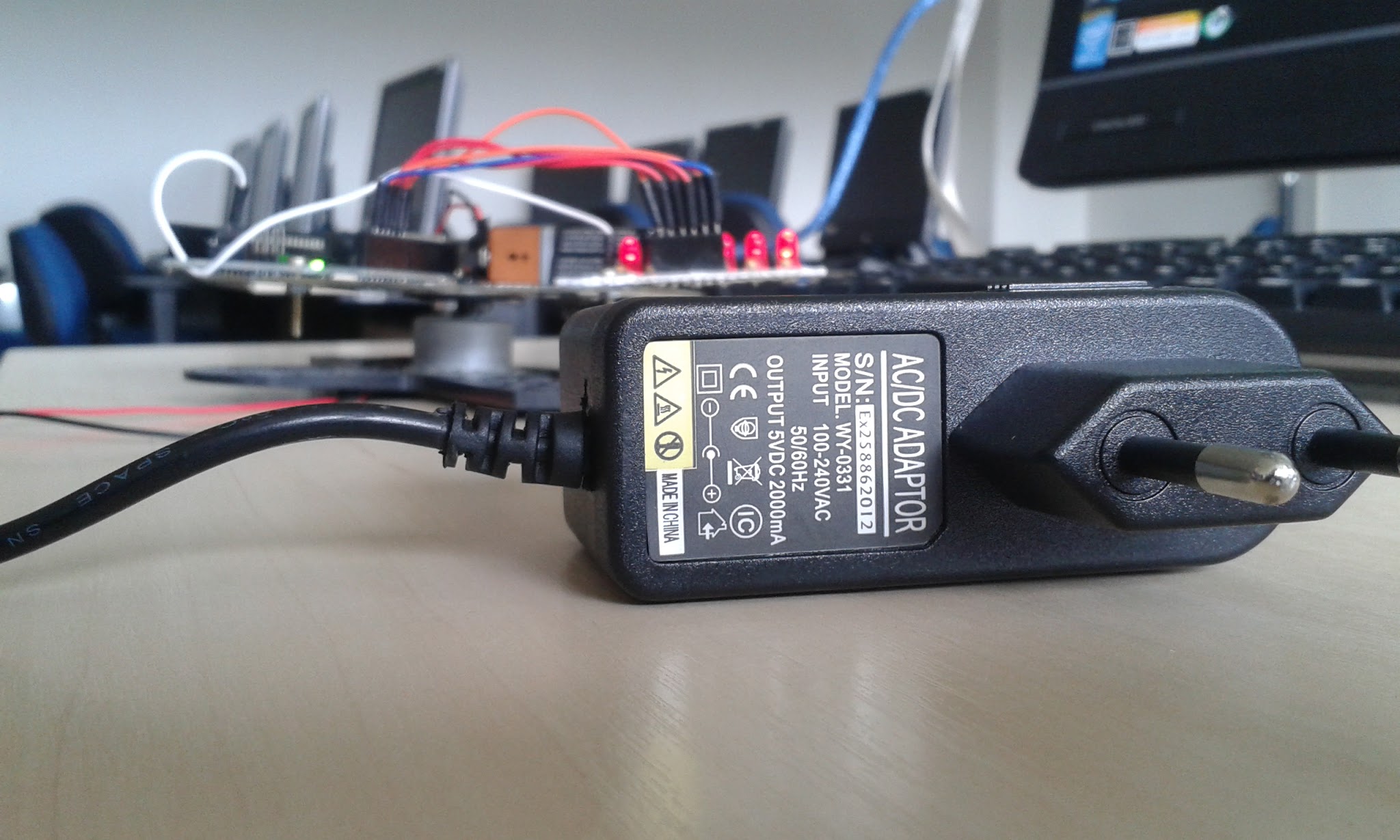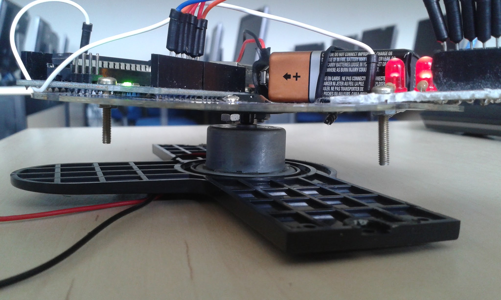 O CD foi colado ao motor do leitor de CD-ROM e este fixado numa base de três pés. Já que não arranjamos nada mais pesado para estabilizar o movimento, ainda precisamos segurar a base com pelo menos duas mãos. O motor é acionado através de dois fios conectados a um carregador bivolt que é ligado à energia elétrica. Foi feita a opção pelo acionamento em separado do Arduino, pelo fato de o motor estar abaixo da base e isso ocasionar uma possível falha ou defeito durante a rotação.