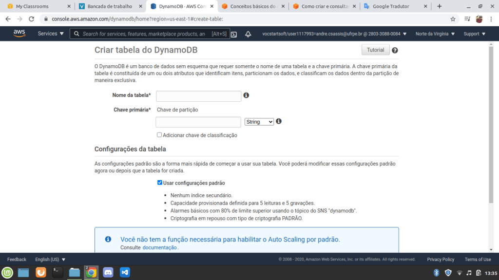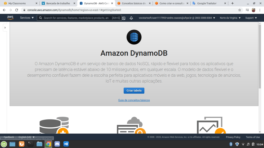 Neste tutorial iremos utilizar apenas o DynamoDB com o AWS console, ou seja, a própria interface da ferramenta disponível na plataforma da AWS. Primeiramente, faça o login na AWS e escolha o serviço DynamoDB. Após acessar o ambiente, é hora de colocar a mão na massa.