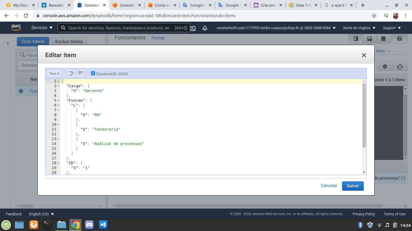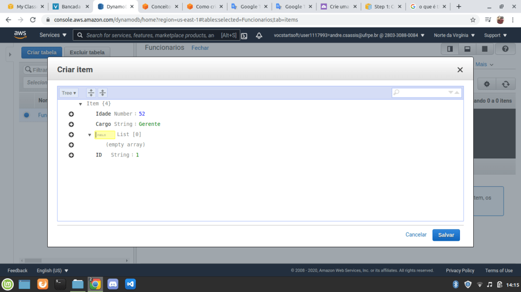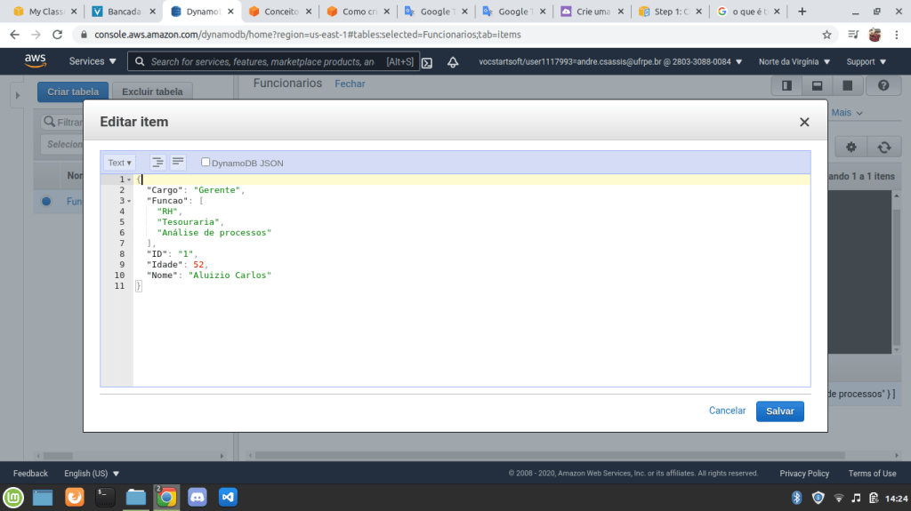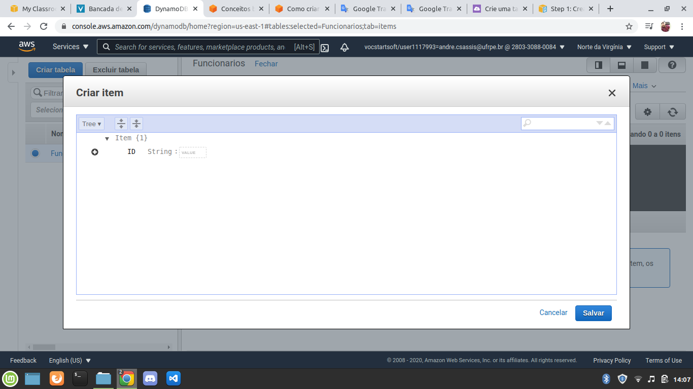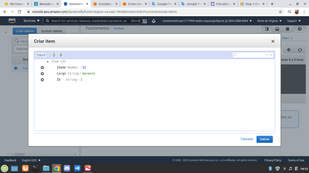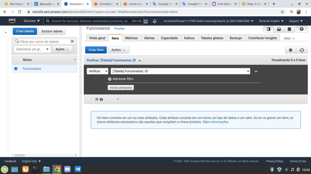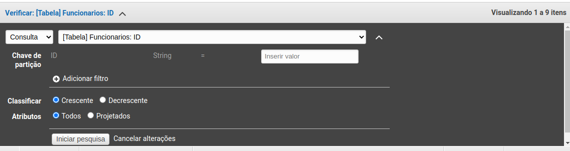 10. Em uma tabela com poucos registros como essa é fácil de recuperar as informações mas, imagine uma tabela com centenas de milhares de registros, já seria mais difícil. Para fazer buscas ou filtrar bases de dados no DynamoDB basta clicar na opção Verificar [Tabela]: Funcionários: ID e você verá essa janela: