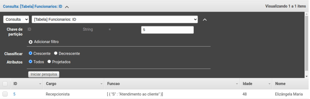 Se você quiser encontrar um registro através da chave de partição (chave primária), basta inserir o valor dessa chave (que em nosso caso é ID) e você verá o registro. Por exemplo, se inserir o valor 5 veremos o registro referente a ID de valor igual a 5, como mostra a figura abaixo.