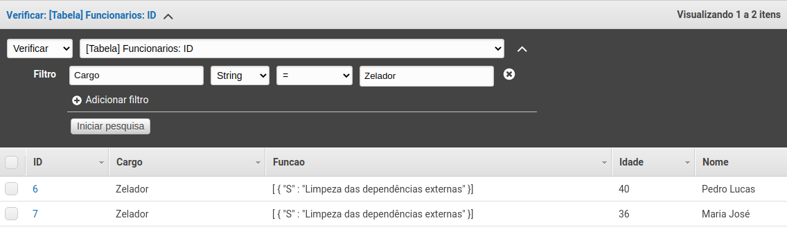 Mas se você deseja filtrar através de outra coluna, basta clicar no botão Consulta, em seguida clicar em Verificar e logo após adicionar um filtro clicando na opção Adicionar Filtro. Então basta escrever o nome da coluna (atributo) e o valor que você quer filtrar e clicar em Iniciar Pesquisa. Por exemplo, abaixo vemos o resultado com os registros filtrados pelo “cargo” igual a “zelador”.