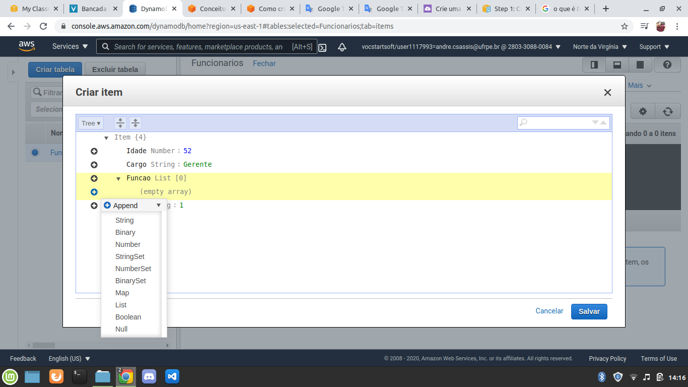Nomeie a coluna, no meu caso eu dei o nome de “Funcao” e para adicionar as funções basta clicar no símbolo + (mais) ao lado esquerdo do nome “(empty array)”. Escolha o tipo, neste caso String, e adicione a função. Para mais de uma função, basta repetir o processo e adicioná-las. Por fim, clique no botão Salvar e assim você terá sua tabela com as colunas e o primeiro registro.