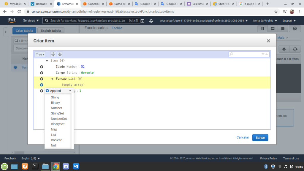 Iremos criar uma tabela [Funcionario] que possui um Chave primária [ID] e outras colunas como: [Nome], [Idade], [Cargo] e [Funcao]. Como mencionado, iremos utilizar o AWS console, mas todo o processo também pode ser construído via CLI ou API.