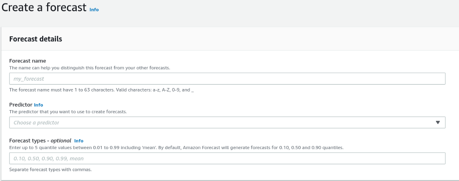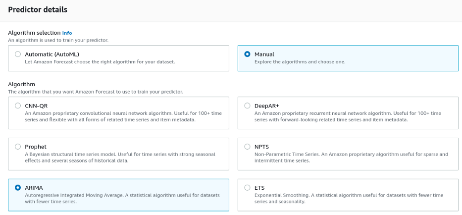 Em “Predictor Details” seleciona a opção “Manual” e “ARIMA”, caso seja deixado como AutoML o AWS Forecast treinará todos os modelos disponíveis e o com melhores métricas será escolhido para as previsões.