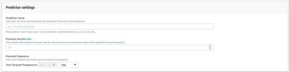 Dá um nome ao modelo (“predictor”), escolha o horizonte de previsão (“Forecasting Horizon”), que é até onde o modelo fará uma previsão (neste experimento foi selecionado valor 15) e seleciona a frequência (aqui diária, “day”).