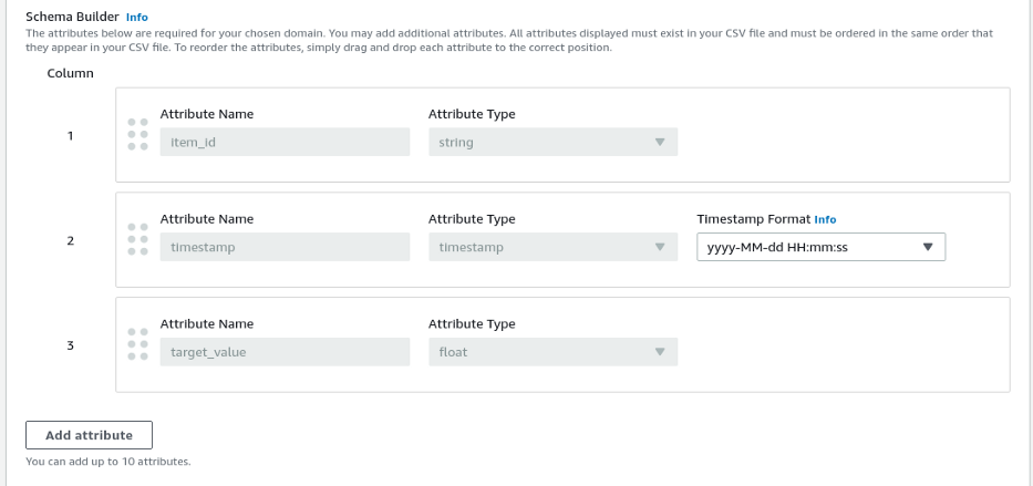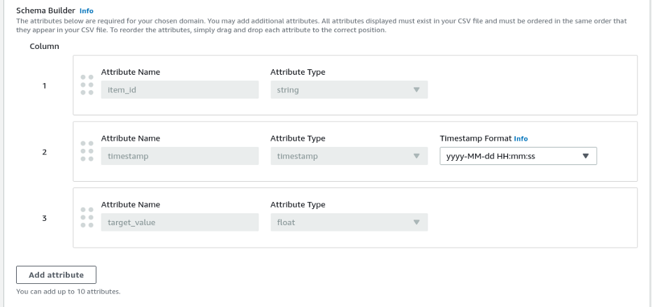 Agora é hora de ajustar o esquema aos dados. Dependendo de como estão posicionadas as colunas de teu csv, muda de lugar as colunas pela parte com nome “Column” arrastando os campos por meio das bolas ao lado desses. Ajusta na coluna “timestamp” o formato, no caso do dataset usado muda-o para o padrão “yyyy-MM-dd”, sem a parte de horas. Não é preciso neste exemplo adicionar mais atributos.