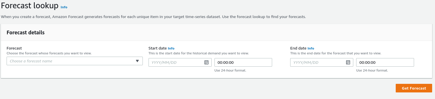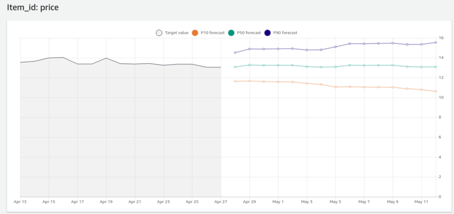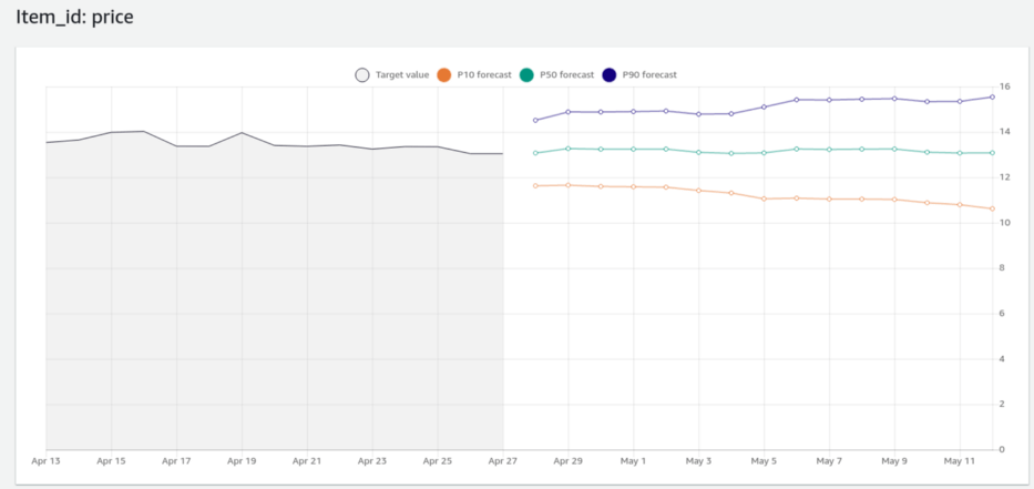 Escolha as previsões criadas a pouco no campo “Forecast” e seleciona os dias de inicio e fim do predito. As datas são baseadas na seleção em “Forecast horizon”, presta atenção aos avisos de erro (se chegarem, aparecerão no topo da tela em vermelho) para datas escolhidas além das capacidades preditivas; chegando erros, modifica as datas. Dois novos campos de preenchimento irão aparecer, “Forecast key” e “value”; neste escreva “price”, naquele selecione “item_id”.