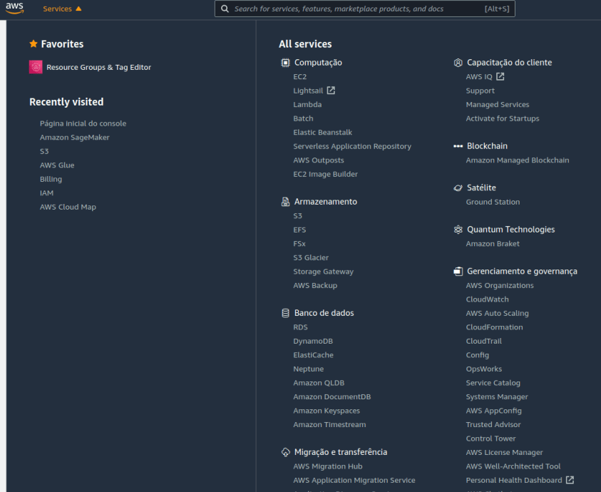 Usando o AWS Console, após logares em tua conta AWS, indo ao botão “Services” na barra acima, ou na busca por serviços, serão exibidos todos os serviços oferecidos pela AWS.