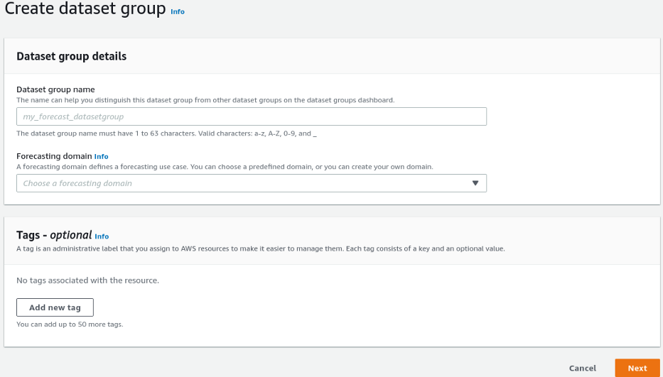 Na próxima página, clica no botão “Create dataset group”. Na sessão posterior ao clique, dá um nome ao grupo de conjunto de dados, de preferência um nome que represente os dados em posse para melhor controle. E escolha o domínio da previsão — forecasting domain — “Custom”. Tais domínios são os esquemas de estruturação de dados que AWS fornece, para o caso de séries temporais “Custom” aparentemente uma é boa escolha. E clica em “Next”.