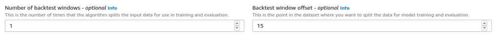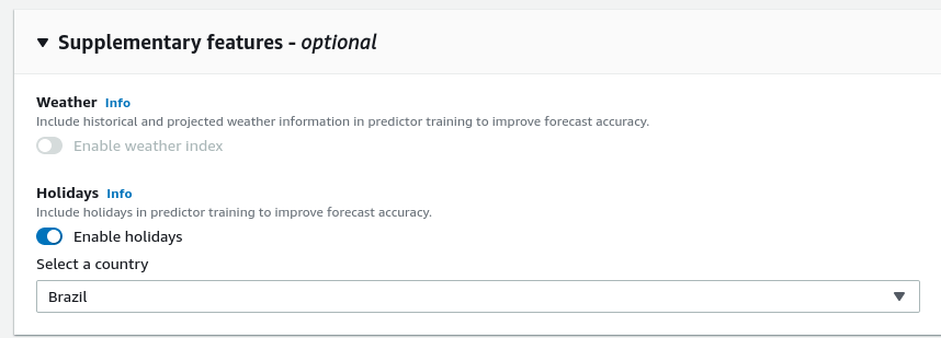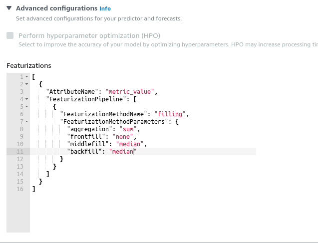 Em “Advanced Configurations” serão ajustadas a formas de imputação de dados em falta, a documentação AWS neste ponto é confusa (uma importante desvantagem que presumo será corrigida em breve). Em “Featurization”, há estas chaves e valores com strings: “frontfill”: “none”;“middlefill”: “zero” e “backfill”: “zero”. Substitui os “zeros” em “backfill” e “middlefill” por “median”, “frontfill” deve ser deixado como está. Neste experimento a forma de imputação foi o uso da mediana (median), usar zeros para séries financeiras geralmente não é um boa estratégia, mas fica a critério do leitor testar outras (as mais usadas são o preenchimento com o valor anterior antes do dado em falta ou interpolação do valor anterior e posterior, mas não são, pelo menos ainda, oferecidas).