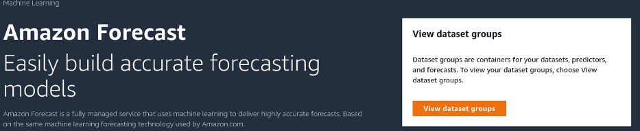 Após os dados preparados e armazenados em AWS S3 (seguindo os passos na sessão anterior). Vá à sessão do Amazon Forecast da barra superior. Em página do Forecast, é preciso agora clicar no botão que verifica os grupos de datasets, pelo botão “View dataset groups”.