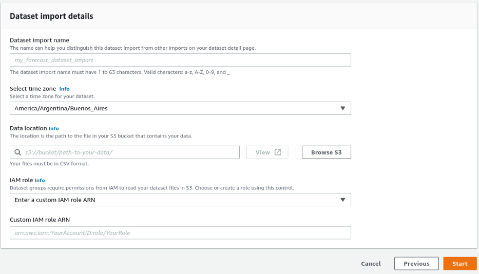 Dá um nome ao dataset para melhor o localizar. É possível usar fuso horário para para série, como os dados são da bolsa de São Paulo, o fuso igual de é America/Argentina/Buenos_Aires (não é obrigado). Na sessão “Browse S3” é onde o arquivo .csv está armazenado, de lá o modelo o usará para o treino. Acessa o local e seleciona o arquivo. Por fim, cria um IAM role, que será um usuário que operará o modelo (uma prática de segurança da AWS). Aperta “Start”.