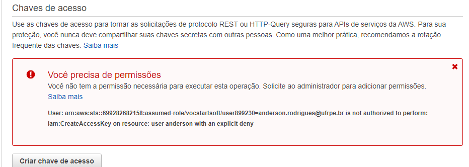 Tento acessar os serviços da AWS via CLI, mas não consigo. Já tentei criar uma chave de acesso no IAM, mas não tenho permissões (como aparece na mensagem abaixo). O que devo fazer?
