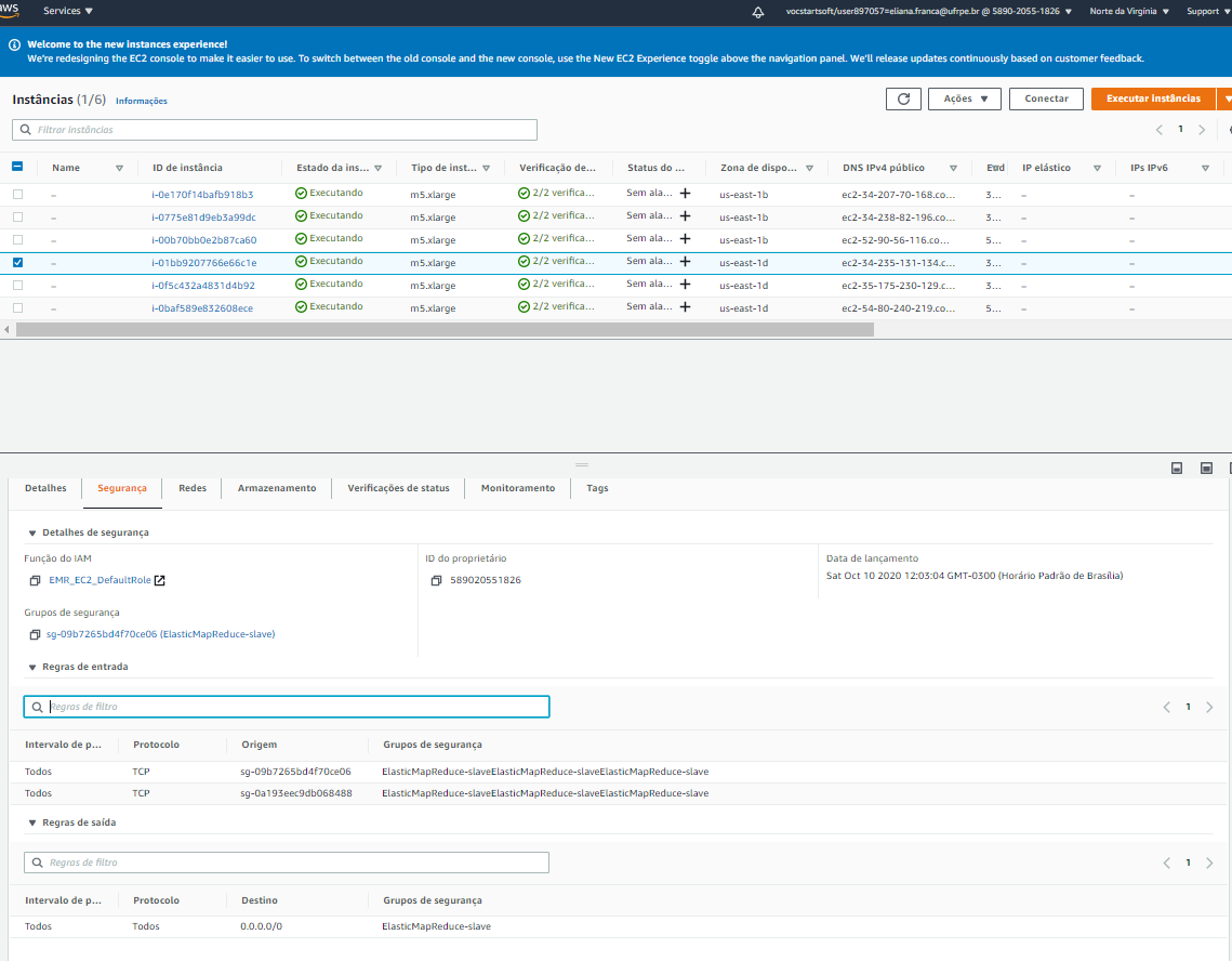 Quando você cria um cluster no EMR, são criados dois grupos de máquinas: um grupo para o nó master e outro grupo para os nós workers. Cada grupo de máquinas está sujeito a um grupo de segurança do EC2 diferente e são estes que você precisará configurar. Para isso, acesse a aba Hardware do seu cluster e clicando sobre uma das máquinas navegue até chegar na tela do EC2.