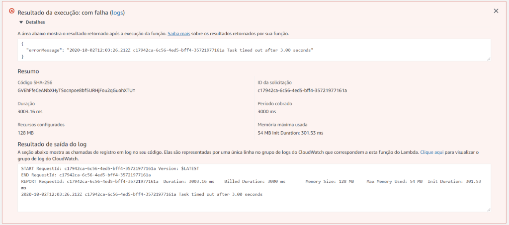 Estou tentando executar uma função no AWS Lambda, mas recebo a mensagem abaixo, informando estouro de tempo. O que fazer?