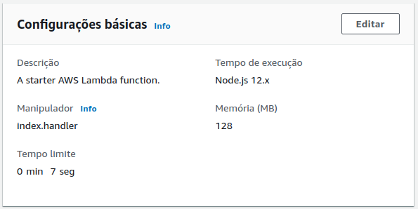 Cada função no AWS Lambda tem um tempo máximo de execução. Isso serve para nos proteger de nós mesmos, imagine a conta que iríamos pagar se deixássemos um loop infinito no código. O valor padrão desta configuração para funções novas no AWS Lambda é de 3 segundos. Mas você pode modificar o tempo limite na seção Configurações básicas da função. Abaixo configuramos para 7 segundos.
