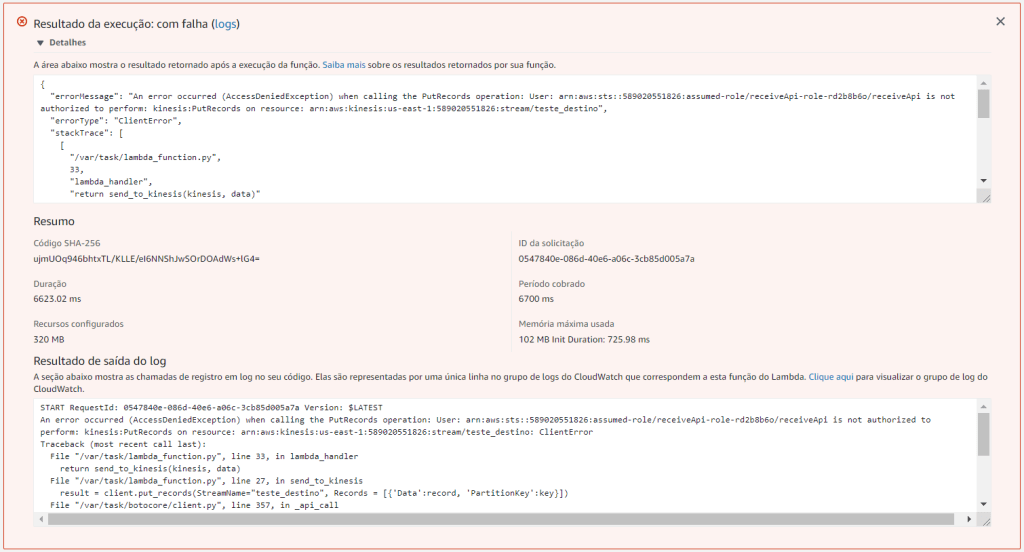 Estou tentando executar uma função no AWS Lambda que escreve no Kinesis Data Streams usando a API AWS boto3 em Python, mas recebo a mensagem abaixo, informando que o uso de PutRecords não está autorizado. O que fazer?